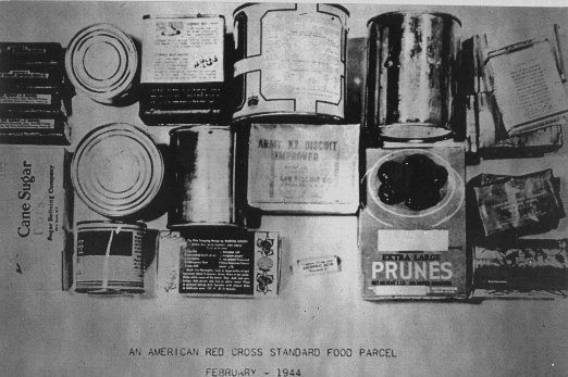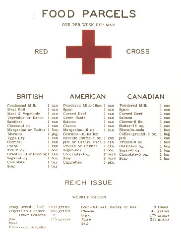 Below are the contents of one of the Red Cross food parcels. Intended issue was one partial parcel per man per week. To feed Stalag Luft III for one week at this rate in January 1945 would have required 11,000 parcels with no reserve.