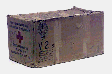 Red Cross food parcels came in large, water-resistant cardboard shipping boxes containing four parcels each. Each parcel, as a supplement to German rations, would safely keep a POW going for one week, 1800 calories per day.
