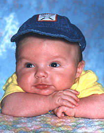 At 13 weeks, Parker had his first go with a professional photographer, and I dare say he was a real trooper. To get the shots, he had to kneel behind a foam pad with his mother supporting his rumpus. Then the photographer positioned his limbs like he was Gumby. But he came through it all right and this is just one of the 10 or so shots we got of him.